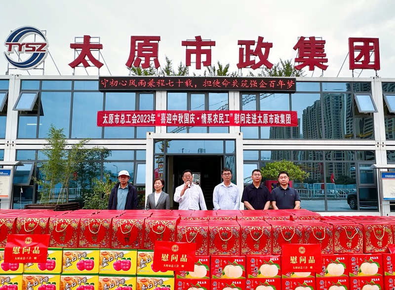 9月19日下午,太原市總工會黨組書記、副主席汪倫,太原市政府農(nóng)民工辦公室科長任俊峰一行來到集團公司興華街周邊排水系統(tǒng)及道路園林景觀提標(biāo)改造工程二標(biāo)段施工現(xiàn)場開展“喜迎中秋國慶·情系農(nóng)民工”慰問活動,送來月餅、豬肉、水果等慰問品。太原市市政公共設(shè)施建設(shè)管理中心興華街項目負責(zé)人牛瑞浩,集團公司黨委委員、紀(jì)委書記李茁,黨委委員、監(jiān)事會主席、工會主席馮忠參加了活動。