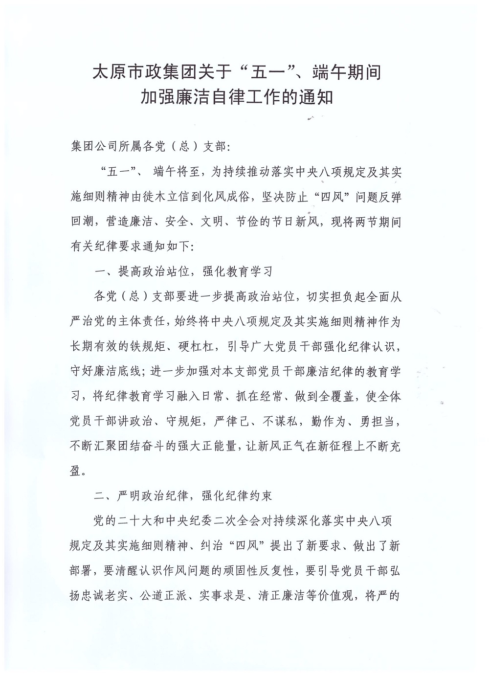 太原市政集團(tuán)關(guān)于“五一”、端午期間加強(qiáng)廉潔自律工作的通知
