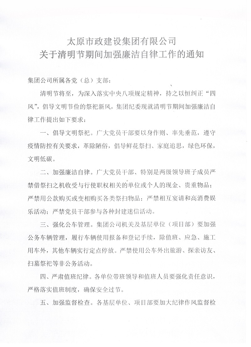 太原市政建設(shè)集團(tuán)有限公司關(guān)于清明節(jié)期間加強(qiáng)廉潔自律工作的通知