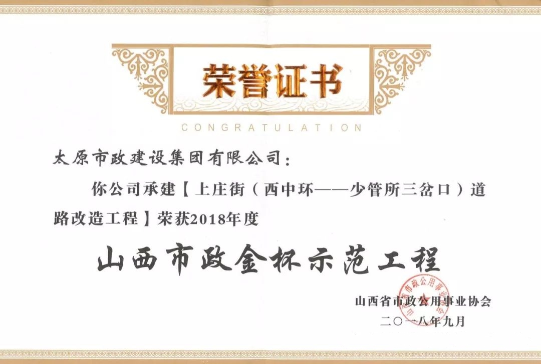 9月20日,太原市政建設(shè)集團(tuán)有限公司承建的太茅路改造工程三標(biāo)段、陽(yáng)泉市污水處理廠二期工程、上莊街(西中環(huán)——少管所三岔口)道路改造工程、太茅路(康寧街——迎賓路)改造工程二標(biāo)段榮獲山西省市政公用事業(yè)協(xié)會(huì)頒發(fā)的2018年度“山西市政金杯示范工程”榮譽(yù)稱號(hào)。