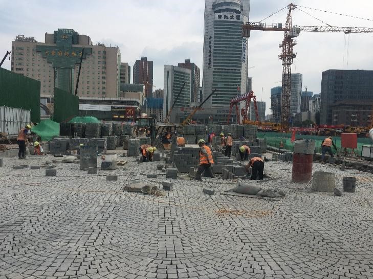 該工程包括七條道路及管網(wǎng)的施工建設(shè),其中涉及大量人工進行花崗丁石的鋪裝任務(wù),項目部結(jié)合實際、統(tǒng)籌管理,將七條道路分為三個工區(qū),形成各條道路互不影響、全面鋪開的施工局面,各工區(qū)針對鋪裝關(guān)鍵點進行隨時監(jiān)測,組織施工人員全天候盯守現(xiàn)場,及時監(jiān)測石材鋪裝過程,嚴(yán)格把控鋪裝紋路、石材縫隙、打磨程度等,確保鋪裝質(zhì)量達到規(guī)定要求。目前,該工程已進入全路面鋪裝階段,平均每天有260多名民建隊人員參與石材鋪筑,項目部將整個隊伍按照花崗巖“切割、鋪裝、灌縫、打磨”的施工環(huán)節(jié)進行分組,各組全面負責(zé)一道工序,極大提升工作積極性,形成相互促進、互相學(xué)習(xí)的良好氛圍,并采用分段鋪裝打磨的方式,有效提高施工效率,保證施工進展。