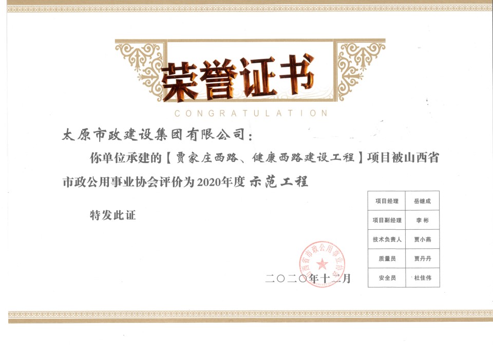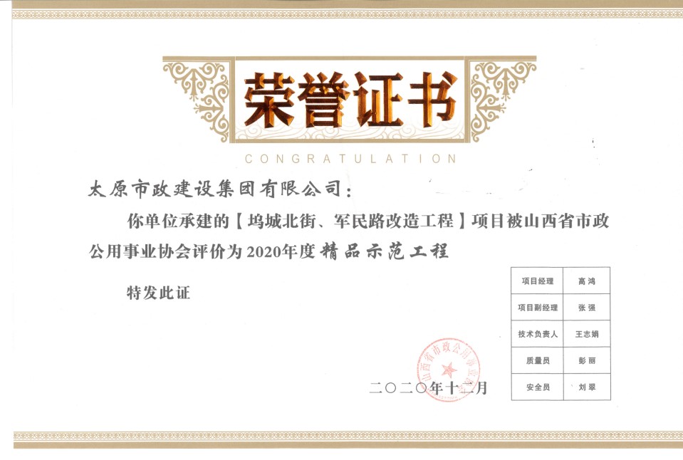 近日,集團(tuán)公司承建的塢城北街、軍民路改造工程被山西省市政公用事業(yè)協(xié)會(huì)評為“2020年度精品示范工程”,東峰路北延(凱旋街—澗河搶險(xiǎn)路)建設(shè)工程,賈家莊西路、健康西路建設(shè)工程被山西省市政公用事業(yè)協(xié)會(huì)評為“2020年度示范工程”。同時(shí),高鴻、孔尹霞在2020年度山西省市政公用事業(yè)協(xié)會(huì)市政工程項(xiàng)目經(jīng)理評價(jià)活動(dòng)中被評為“優(yōu)秀項(xiàng)目經(jīng)理”。