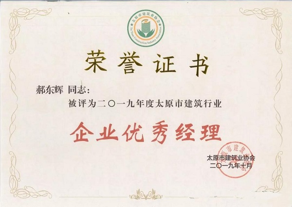 集團公司黨委書記、董事長郝東輝榮獲“2019年度太原市建筑行業(yè)企業(yè)優(yōu)秀經(jīng)理榮譽稱號。