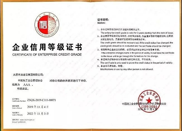 太原市政建設(shè)集團(tuán)有限公司榮獲“企業(yè)信用評價AAA級信用企業(yè)”榮譽(yù)稱號 發(fā)布時間:2019-12-06 10:31:35  來源:本站  閱讀:26789